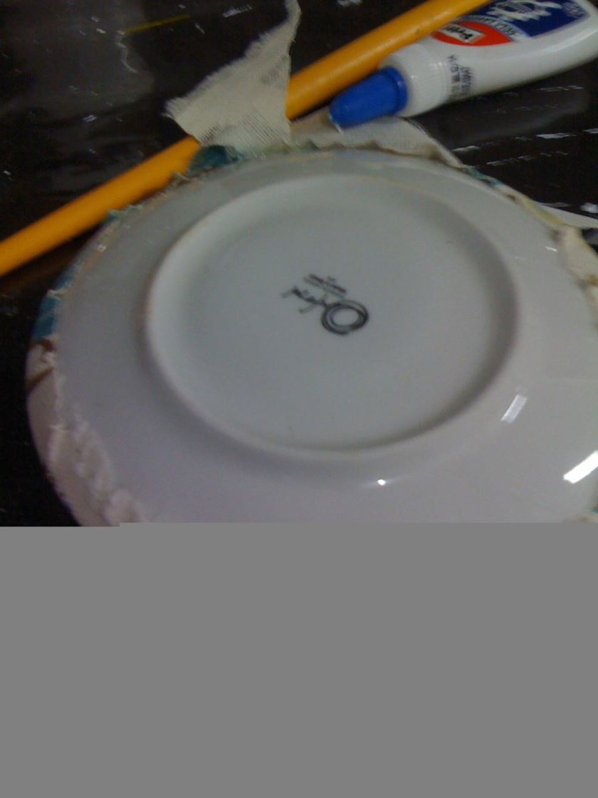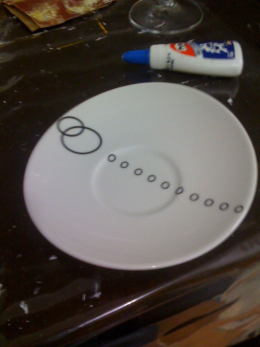 Passei cola branca no prato, colei o tecido e alisei bem certinho. Na borda da parte de trás eu colei com cola quente pra ficar bem resistente (depois é só retirar tudo, e usar o pires de novo).