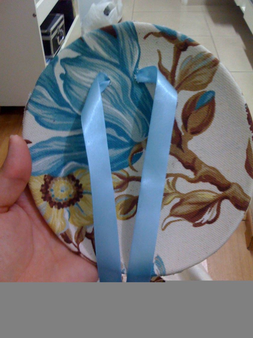 Nesta hora vc faz dois furinhos no tecido, um do lado do outro, e coloca sua fita de cetim com as duas pontas pra fora.